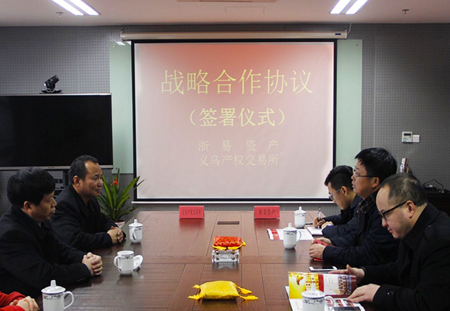 2016年2月4日,浙易資產(chǎn)與義烏市產(chǎn)權(quán)交易所簽訂戰(zhàn)略合作協(xié)議,浙易資產(chǎn)董事長朱巧偉、總經(jīng)理曹晨及義烏產(chǎn)交所總經(jīng)理趙秋明、副總經(jīng)理陳喜忠出席。