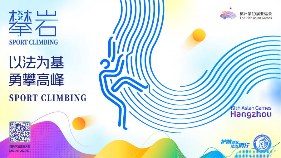 配套海報從擊劍、蹦床、籃球、舉重、田徑、攀巖、游泳、賽艇等比賽項目中提煉出法治元素,使亞運和法治產(chǎn)生關(guān)聯(lián)和共鳴。