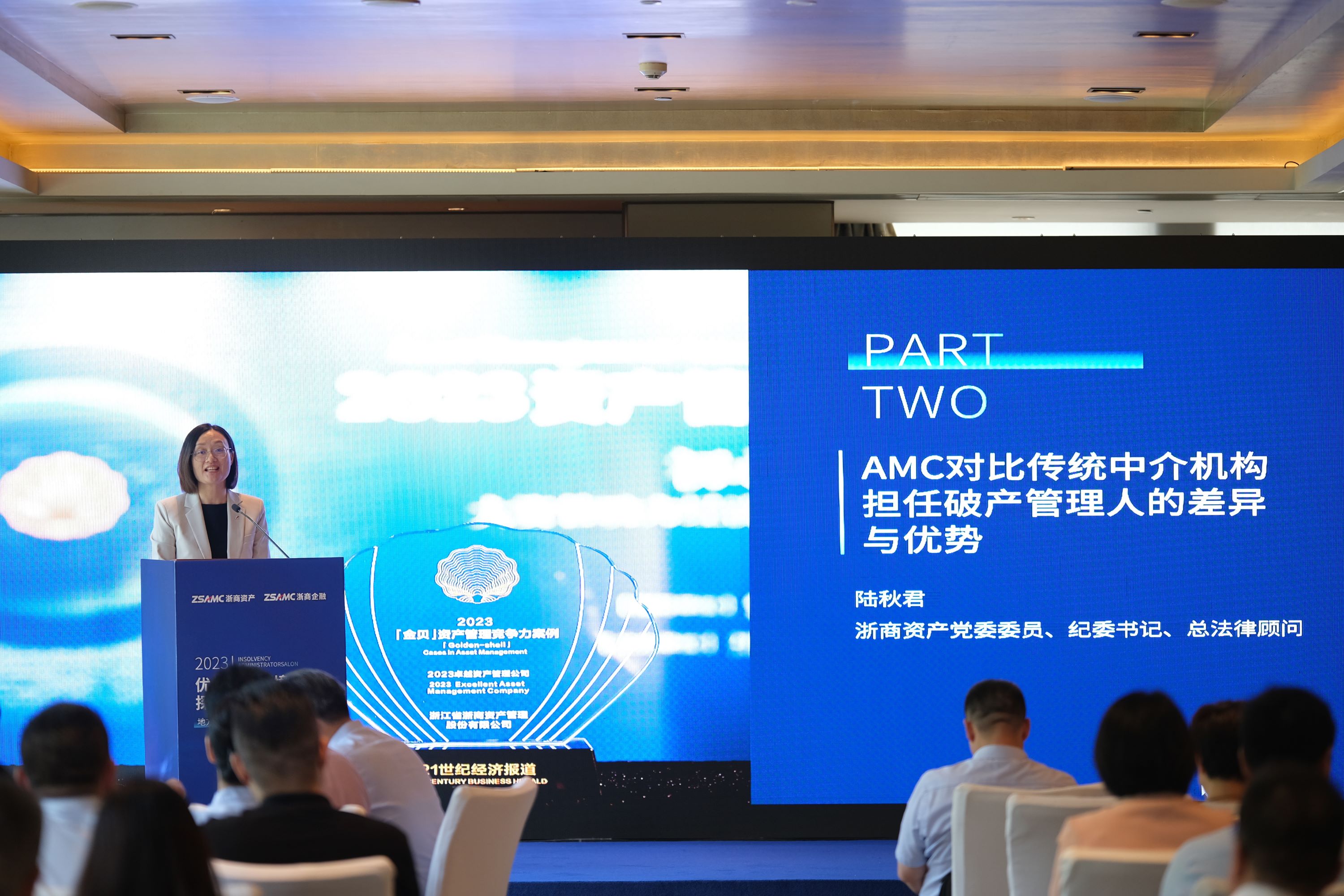 浙商資產(chǎn)黨委委員、紀(jì)委書記、總法律顧問陸秋君從專業(yè)經(jīng)驗(yàn)、治理結(jié)構(gòu)、人才配置、資源整合、資金融通等方面著重分析了AMC對(duì)比傳統(tǒng)中介機(jī)構(gòu)在擔(dān)任破產(chǎn)管理人方面的比較優(yōu)勢(shì),并指出AMC應(yīng)準(zhǔn)確把握當(dāng)前經(jīng)濟(jì)社會(huì)發(fā)展新形勢(shì),加強(qiáng)破產(chǎn)管理業(yè)務(wù)的雙向加速賦能,依照前瞻化、市場(chǎng)化、法治化原則,因地制宜,采取債權(quán)轉(zhuǎn)讓、托管、債務(wù)重組、資產(chǎn)重組、共益?zhèn)⑵飘a(chǎn)重整、市場(chǎng)化債轉(zhuǎn)股、財(cái)務(wù)顧問等多種方式化解風(fēng)險(xiǎn),充分發(fā)揮地方AMC功能作用。