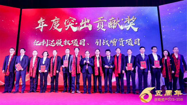 隨后,在熱烈的掌聲中,2018年度浙商資產(chǎn)突出貢獻(xiàn)獎(jiǎng)獲獎(jiǎng)團(tuán)隊(duì)——億利達(dá)項(xiàng)目團(tuán)隊(duì)和引戰(zhàn)增資項(xiàng)目團(tuán)隊(duì)相繼站上舞臺,孫建華董事長、集團(tuán)其他領(lǐng)導(dǎo)、浙商資產(chǎn)董監(jiān)高等為獲獎(jiǎng)人員頒發(fā)獎(jiǎng)杯并留影,以表彰兩支隊(duì)伍在過去一年中為浙商資產(chǎn)開啟產(chǎn)融協(xié)同新格局和多元化股東新時(shí)代做出的突出貢獻(xiàn)。