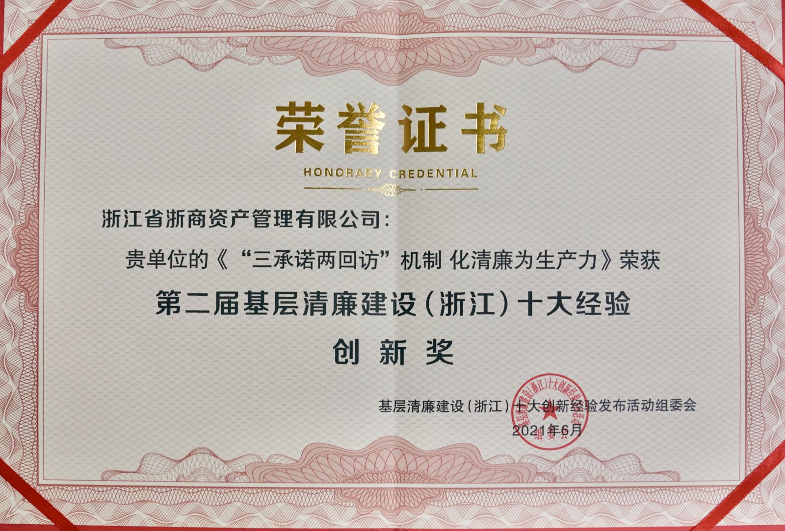 6月18日,由省紀(jì)委省監(jiān)委指導(dǎo),浙江日?qǐng)?bào)報(bào)業(yè)集團(tuán)、浙江大學(xué)主辦,《反腐敗導(dǎo)刊》雜志社、浙江大學(xué)廉政研究中心承辦的第二屆“基層清廉建設(shè)(浙江)十大經(jīng)驗(yàn)”發(fā)布活動(dòng)在杭州隆重舉行,浙商資產(chǎn)《“三承諾兩回訪(fǎng)”機(jī)制 化清廉為生產(chǎn)力》榮獲“創(chuàng)新獎(jiǎng)”。